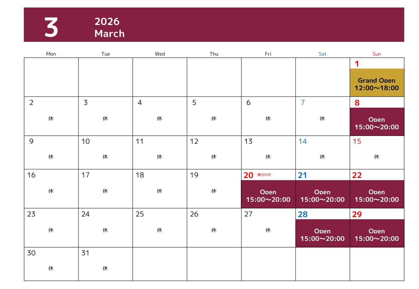 3月1日 グランドオープンのお知らせ 2026.02.28 3月1日(日) 12:00よりオープンいたします。 システムの都合により、3月1日は現金のみでのお支払いとさせていただきます。 ご不便をおかけしますが、何卒ご了承ください。 みなさまのご来店を心よりお待ちしております。